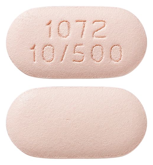 - Pink biconvex, capsule-shaped, film-coated tablet with "1072" and "10/500" debossed on one side and plain on the other side